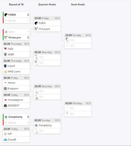 BLAST Premier秋季赛showdown首日两场对局都是“同赛区”队伍的争夺,两支CIS地区的队伍Spirit和Virtus.pro为我们展现出了CIS地区特色——枪法与平推,最终VP更胜一筹2-1淘汰对手,另外一边FURIA面对到阿根廷队伍Isurus,两边分别在前两图碾压对手,决胜图中FURIA还是抓住机会一波带走对手。
