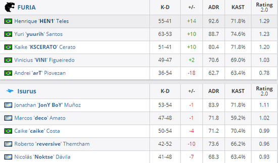 两支来自南美队伍的对决前两张图似乎就像热身一般,两张地图加起来不过41个回合,可谓是“速战速决”。deco和HEN1分别在两张地图上爆发带领队伍碾压对手,图二HEN1的rating更是达到了恐怖的1.86。进入决胜图,画风突变,FURIA虽然上半场连拿五分但是Isurus这边并没有像前一张地图一样一蹶不振,他们通过快攻拿回些分数,半场9-6结束。进入到下半场FURIA依旧先声夺人,一波6-1直接拿到赛点,可是Isurus也是一路连拿7分追到最后一局,好在FURIA众人把握住了最后机会16-14击败对手,晋级下一轮。