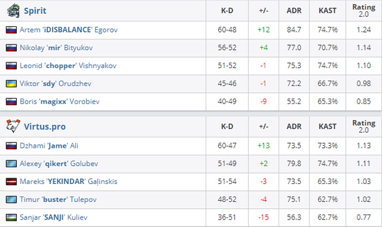BLAST Premier秋季赛showdown,VP首轮的对手就是Spirit,两支CIS地区的队伍也是多次交手互相都有充足的了解,双方比拼的就是谁的状态更好,谁的临场表现更佳。双方都拿下了对手的选图,图一Mirage上mir和iDISBALANCE发挥出色分别以1.76和1.73的rating带领队伍取得胜利,而Train则是Jame的秀场。来到Inferno,率先做防守的Virtus.pro取得优势半场10-5领先,取得优势的他们稳扎稳打最终以16-8的比分终结了比赛,淘汰了Spirit。