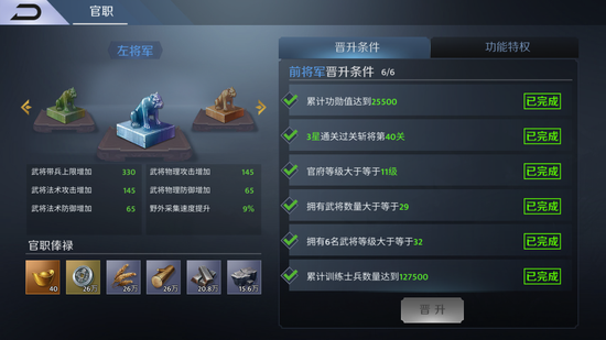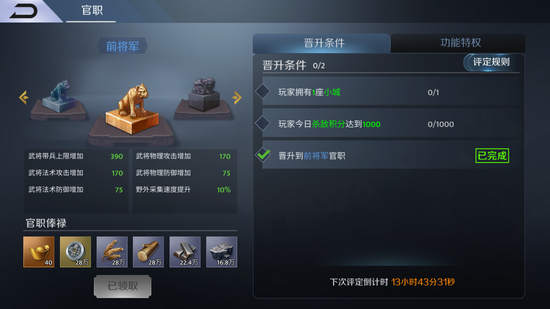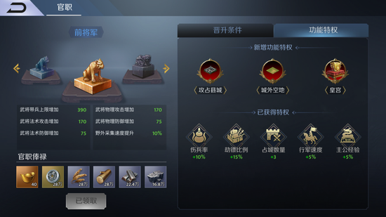 玩家晋升前将军官衔前,官职的晋级条件为固定成长条件,达成难度降低,玩家除了可以领取每日的官职俸禄还可以解锁官职特权。
