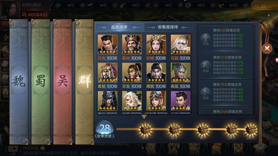 图鉴系统为《止戈》新增的收集玩法,游戏内的武将角色图鉴按所属阵营分为魏、蜀、吴、群雄4种,武将属性加成按武将持有数量分为5挡,拥有的同阵营武将角色越多,该阵营武将的整体属性加成就越高。